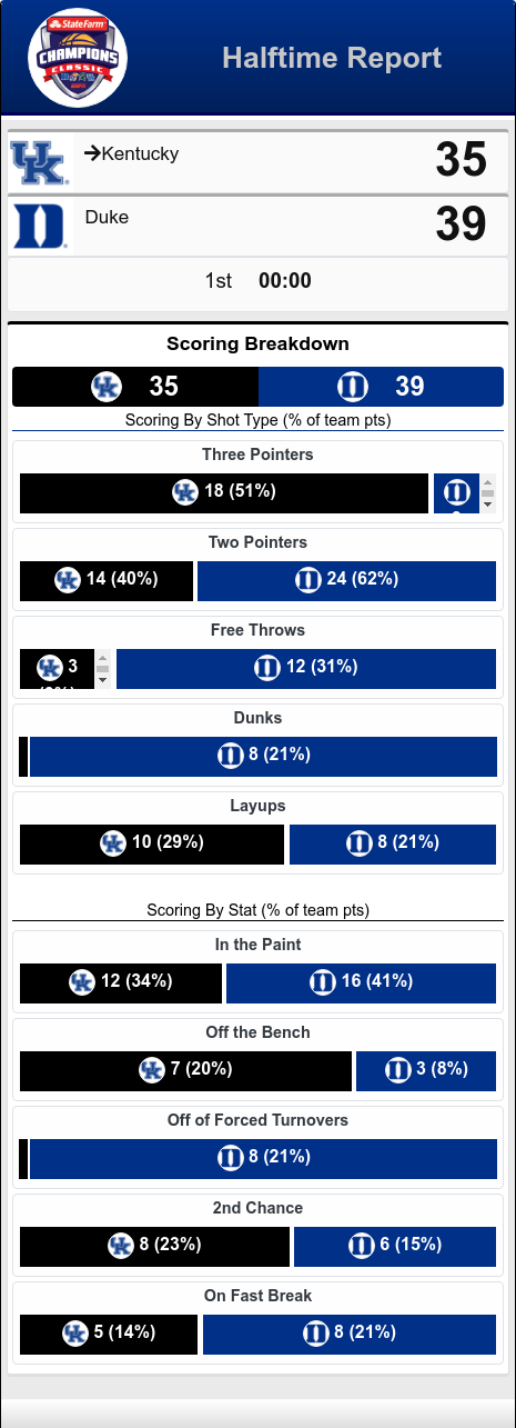 -halftime-JohnNov 9, 20211 min readIt's halftime in New York, NY. And we have the lead... by 4.Here is a more in-depth look at the stats:Here is more#GODUKE #WIIIIIN